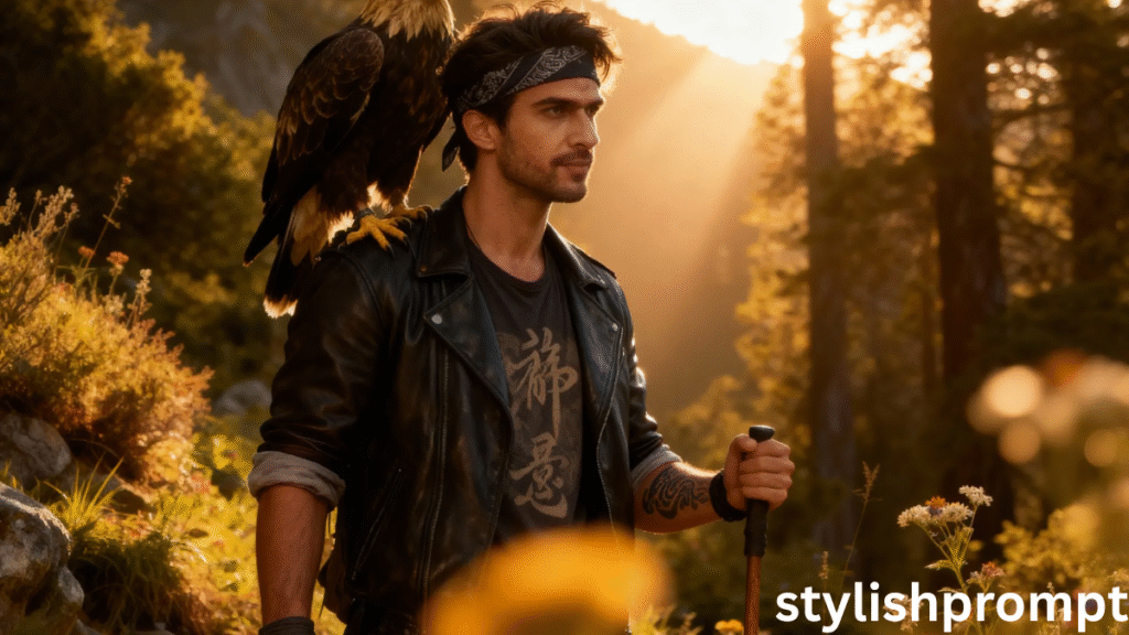 When I first tried this, I used a simple photo from a forest trail during dusk. My jacket was a plain denim cut, no eagle in sight. I wrote my own prompt (loosely similar to yours), inserted the photo, and waited.