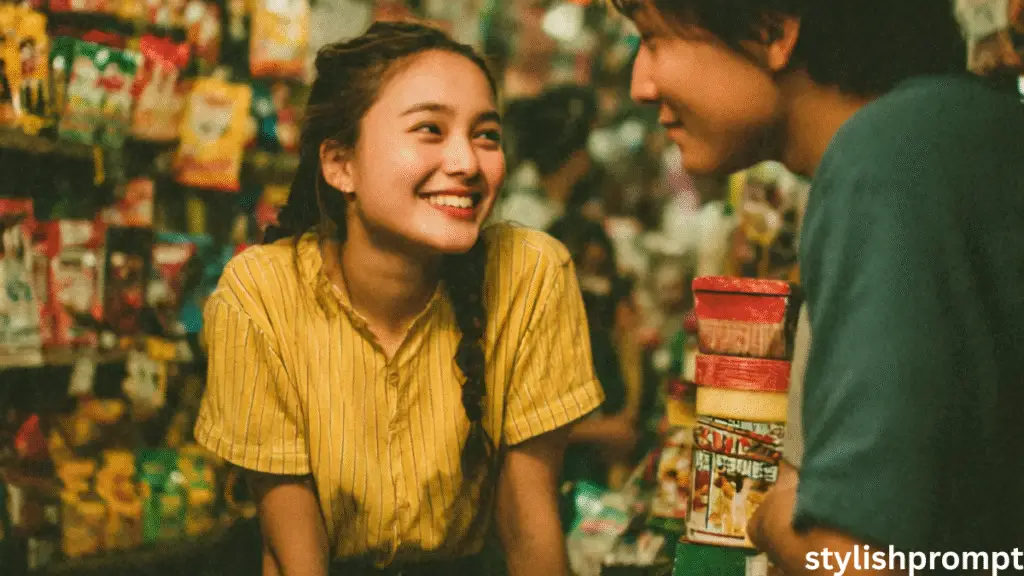 a couple in a cozy convenience store, intimate and warm atmosphere, woman in striped yellow shirt sitting on glass counter, man leaning beside her, smiling at each other, cinematic film grain, soft lighting, shallow depth of field, Fujifilm tones, 35mm film look –ar 4:5 –v 7 –style raw –q 2″